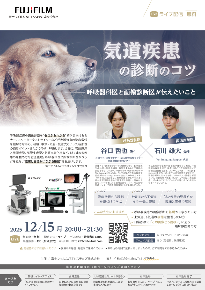 さらに、喉頭麻痺と喉頭虚脱、気管支虚脱と気管支軟化症など、似て非なる疾患の見極め方を徹底整理。呼吸器科医と画像診断医がタッグを組み、“臨床と画像がつながる瞬間”をお届けします。